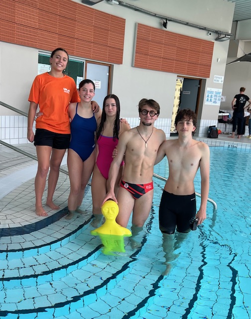 Les 4 nageurs (Chloé en 2de et Anna , Baptiste et Ewan en terminale) se sont dépassés en se partageant les 6 courses (100NL/ 100Dos/100 Brasse / 50Pap/ 200 palmes et 2004 nages.) + 2 relais + épreuve de sauvetage mannequin chronométrée.