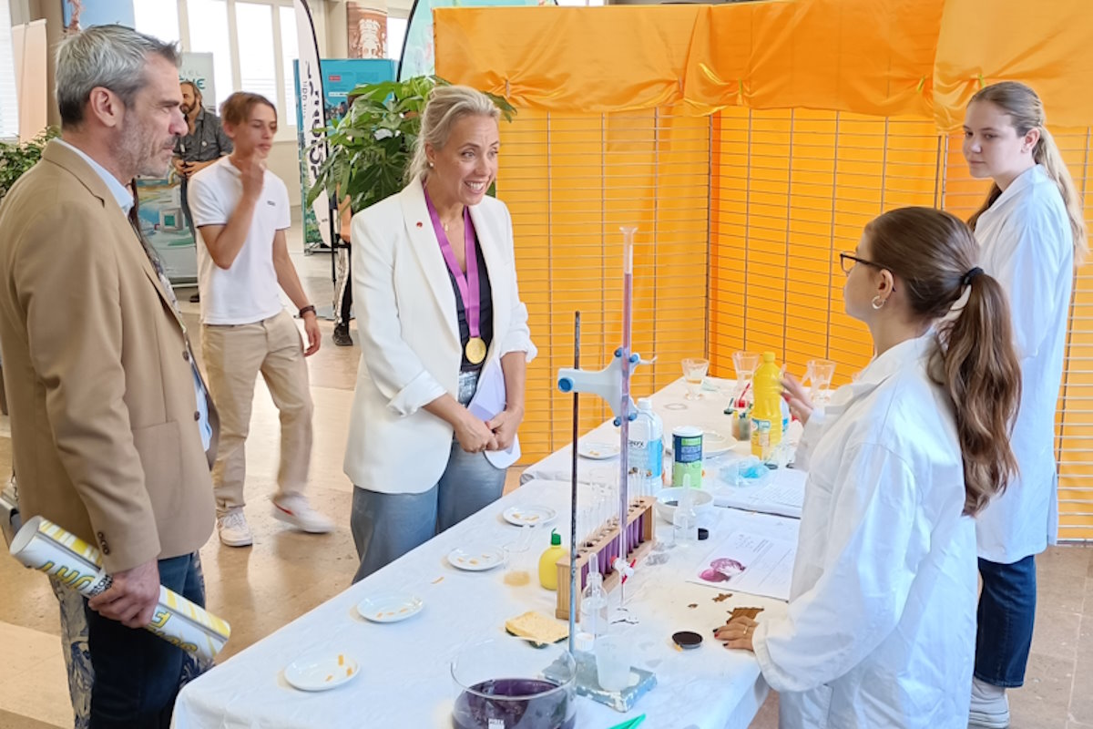 Mme Nadia Pellefigue, Vice-Présidente de la région Occitanie à l' Enseignement supérieur, Recherche, Europe et Relations Internationales a été impressionnée par les connaissances, la dextérité et l'assurance de nos apprenties chimistes.