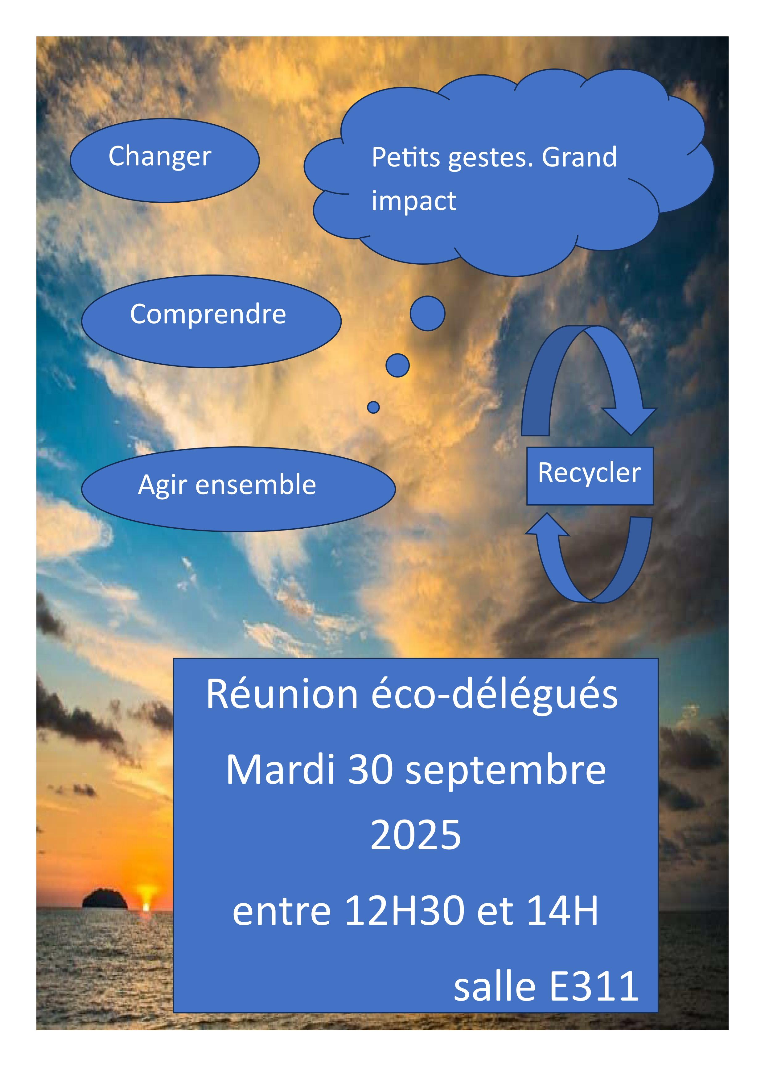 La réunion des éco-délégués est prévue ce mardi 30 septembre entre 12h30 et 14h00 en salle E311.